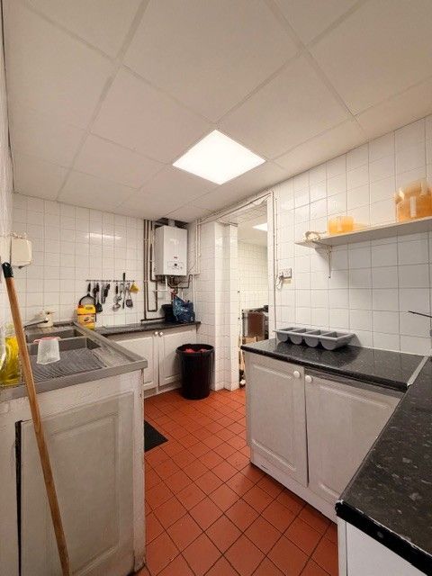 Rear Kitchen with tiled flooring and base units, shelves, stainless steel sinks, fryer and boiler.